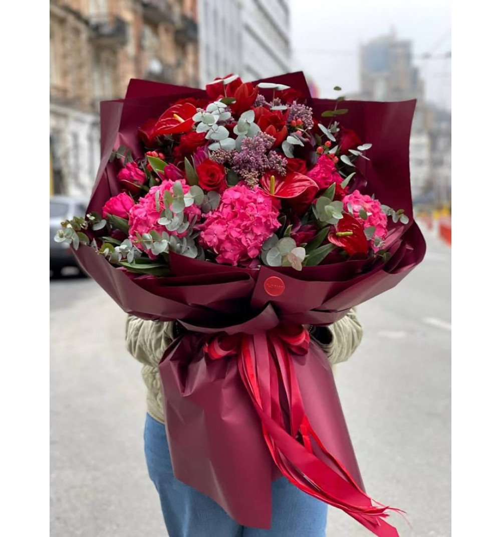 Яркий и стильный букет из пышных гортензий, изящных калл, ароматных роз и свежего эвкалипта — идеальное сочетание элегантности и свежести.
